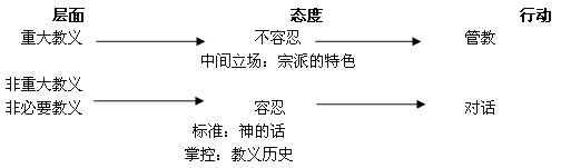 不过,还有一种中间立场:许多时候,在宗派的发展过程中,圣经并未指明是基本教义的问题,会变成重大教义。举例而言,就如以上所提加尔文派或亚米念派的教义,或灵恩和千禧年的辩论。这种状况发生时,最好的办法,是个人要承认,宗派有权判断它的特色,可是也要帮助在该团体中的人明白,这并不是重大教义,因此要尊重意见不同的其他宗派人士。有时,如果有人对某件事持很强的看法(如妇女在教会的地位--参下文),那个人可以鼓励整个团体进行改革,不再视该问题为重大教义,能让对抗的意见发表其看法。